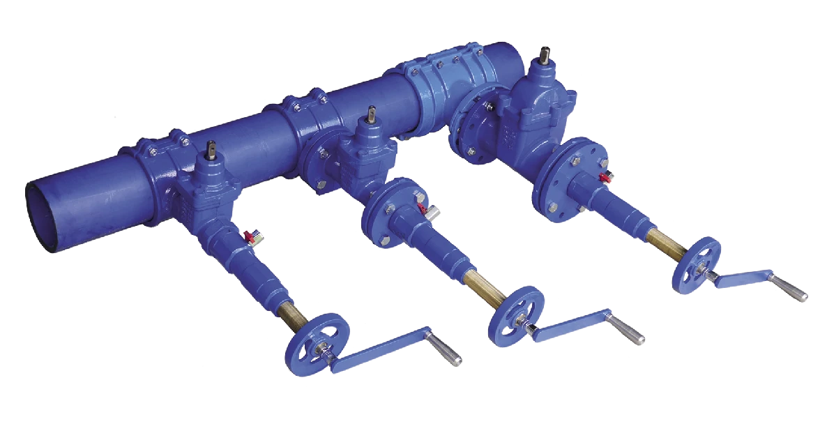 - Dobrać króciec redukcyjny i wiertło, stosownie do średnicy zasuwy z opaską i materiału rury wodociągowej. Dobrać długość wrzeciona w zależności od długości zabudowy, w taki sposób aby możliwe było zamknięcie zasuwy po dokonaniu nawiercenia. Dobór zweryfikować pomiarem.